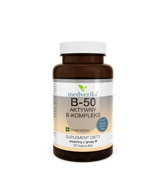 B-50 Aktywny B-kompleks firmy Medverita to suplement diety zawierający wysoko przyswajalne formy witamin z grupy B, w tym metylokobalaminę (witamina B12), folian Quatrefolic® (aktywny kwas foliowy), oraz koenzymatyczną witaminę B6 (P-5-P). Te zaawansowane formy nie wymagają przekształceń w organizmie, dzięki czemu zapewniają szybkie i skuteczne wsparcie dla metabolizmu, układu nerwowego i energii. Preparat jest wolny od zbędnych dodatków, co czyni go doskonałym wyborem dla świadomych konsumentów. Jedna kapsułka dostarcza optymalne dawki witamin z grupy B dla codziennej suplementacji.