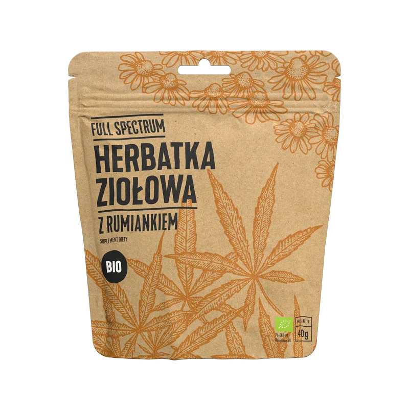 • Kwiat rumianku BIO (Matricariae flos) – 40% – znany ze swojego łagodnego wpływu na układ pokarmowy i pomoc w odprężeniu po dniu pełnym wrażeń.