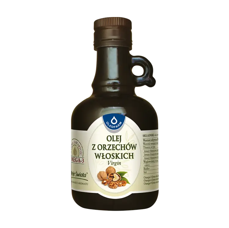 Olej z orzechów włoskich to wyśmienity, zdrowy i smaczny, miodowożółty olej przepełniony wartościami odżywczymi o prozdrowotnych właściwościach. Jest jednym z najbogatszych źródeł niezbędnych nienasyconych kwasów tłuszczowych, witamin i minerałów, pozyskiwany w wyniku tłoczenia na zimno miąższu orzechów włoskich, uchodzi za towar luksusowy i rzadki. Wydatnie wspiera organizm w walce z infekcjami i nadwagą, oczyszcza ciało i działa przeciwbólowo. Właściwości oleju wykorzystuje się w kosmetyce – do ochrony skóry przed oznakami starzenia – oraz w kuchni – do wzbogacania bukietów smakowych potraw, dań i przekąsek.