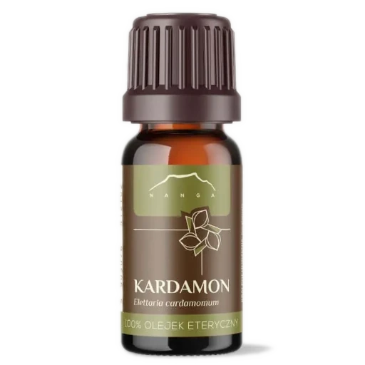 Kardamonowy olejek eteryczny pozyskiwany jest z nasion kardamonu malabarskiego (Elettaria cardamomum), uprawianego w Indiach. Powstaje wskutek destylacji z parą wodną, jego zapach jest ciepły i korzenny, a kolor waha się od bezbarwnego do bladożółtego. Delikatne masaże brzucha z jego dodatkiem wspierają trawienie i łagodzą wzdęcia, a stosowany na całe ciało, przyjemnie rozgrzewa oraz relaksuje. Wdychanie olejku kardamonowego poprawia koncentrację oraz nastrój, a także wspomaga kurację przeziębień oraz infekcji układu oddechowego.