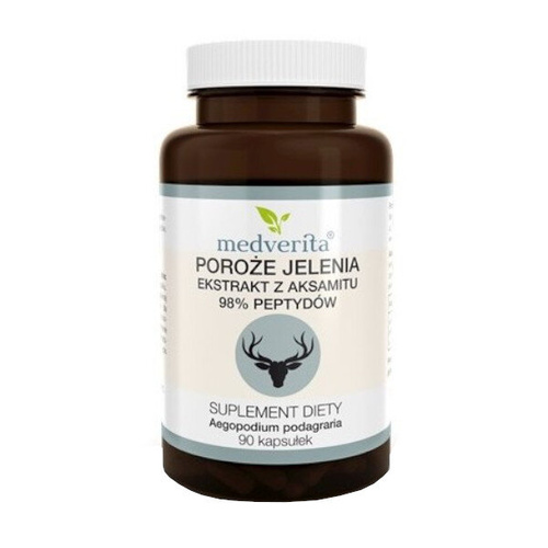 MEDVERITA Poroże Jelenia 98% to wysokiej jakości suplement diety zawierający standaryzowany ekstrakt z poroża jelenia szlachetnego (Cervus elaphus), bogaty w peptydy (98%). Składnik ten jest stosowany jako naturalne wsparcie dla zdrowia stawów, kości oraz ogólnej kondycji organizmu. Produkt dedykowany jest osobom aktywnym fizycznie, sportowcom oraz osobom starszym dbającym o mobilność i sprawność ruchową.