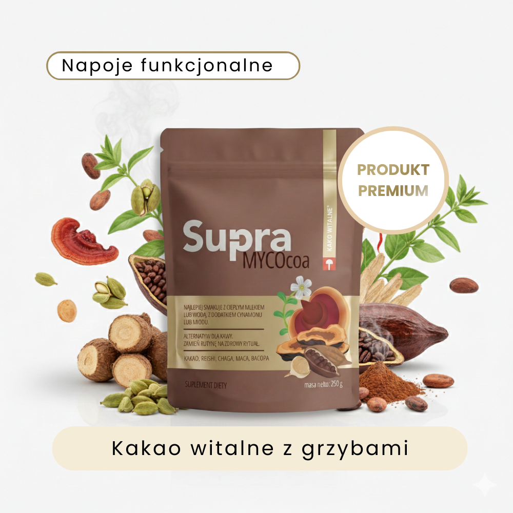 Tradycja, smak i nowoczesny rytuał SUPRA MYCOcoa to zaproszenie do celebracji chwili, w której głęboki, aksamitny smak tradycyjnego kakao spotyka się z bogactwem darów natury. Inspiracją dla tej receptury była chęć powrotu do autentyczności – do czasów, gdy napoje przygotowywane w domowym zaciszu były symbolem spokoju i beztroski.