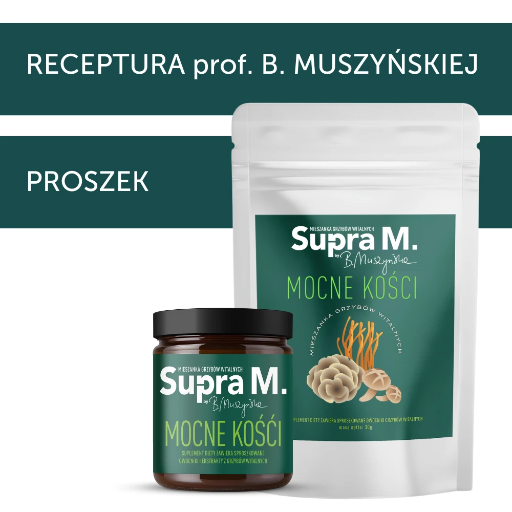 SupraM Mocne Kości to suplement diety stworzony we współpracy z prof. Bożeną Muszyńską – specjalistką w dziedzinie fitochemii i mykologii. Produkt łączy wiedzę naukową z siłą natury, oferując unikalną kompozycję trzech grzybów witalnych.