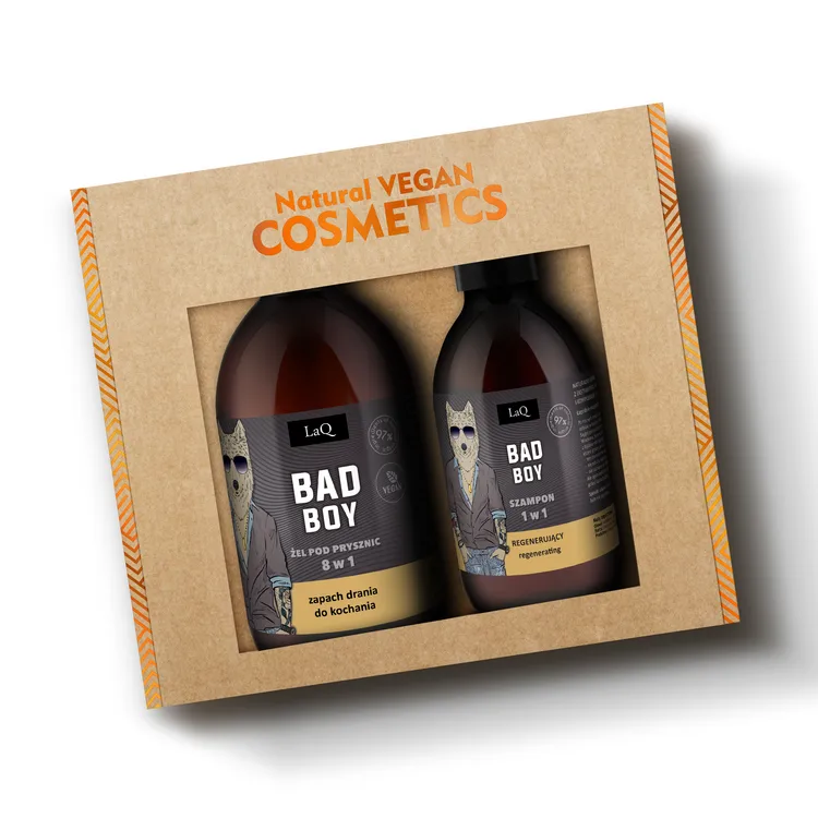 Wegański zestaw kosmetyków naturalnych dla mężczyzny, składający się z żelu pod prysznic oraz szamponu do włosów.