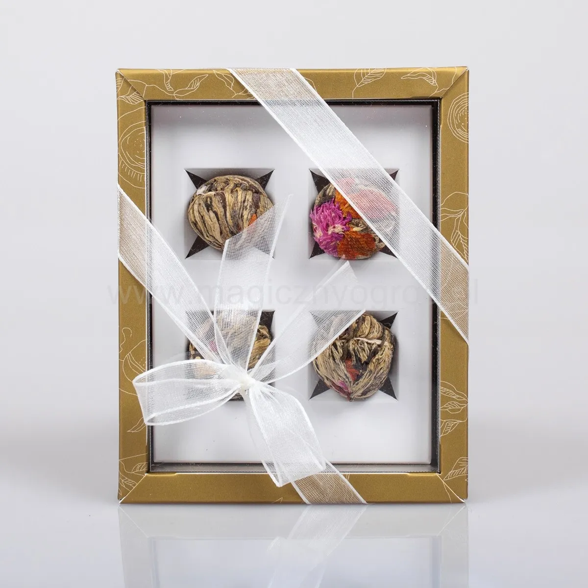 Aromatyczny zestaw czterech białych herbat kwitnących zapakowanych w ozdobne pudełko, Idealny prezent dla smakoszy i estetów.